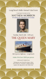 Join us for an unforgettable evening at the Long Beach Ballet’s annual fundraising gala aboard the iconic Queen Mary. We are pleased to welcome special guest Matthew Morrison, whose talent and presence will make this year’s event especially meaningful. Prepare for an evening of world-class entertainment, inspired company, and meaningful impact — all in support of the arts. ✨